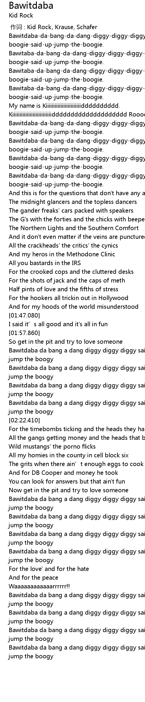 | [02:50.550] | Bawitdaba da bang a dang diggy diggy diggy said the boogy said up jump the boogy |