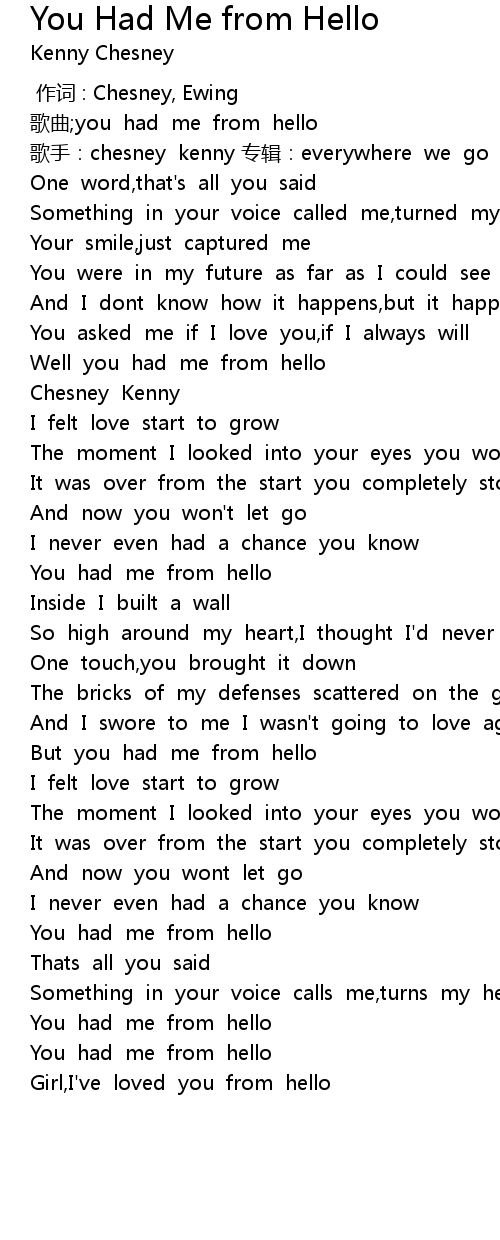 | [00:05.420] | 歌手:chesney kenny 专辑:everywhere we go |