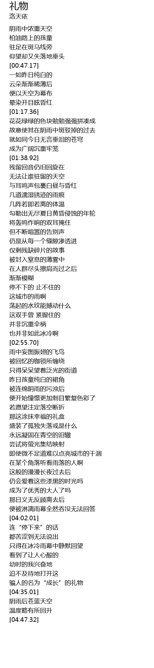 | [04:22.14] | piàn rén de míng wéi" chéng zhǎng" de lǐ wù |