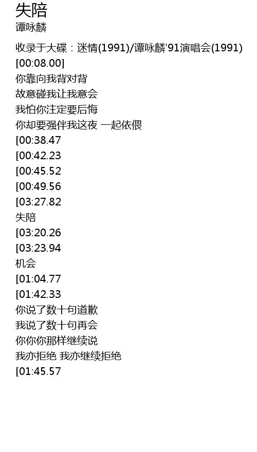 | [03:31.54][03:27.82][03:16.67][03:01.28][02:50.03][02:38.67][01:30.87][00:52.71] | 只好失陪 失陪 |