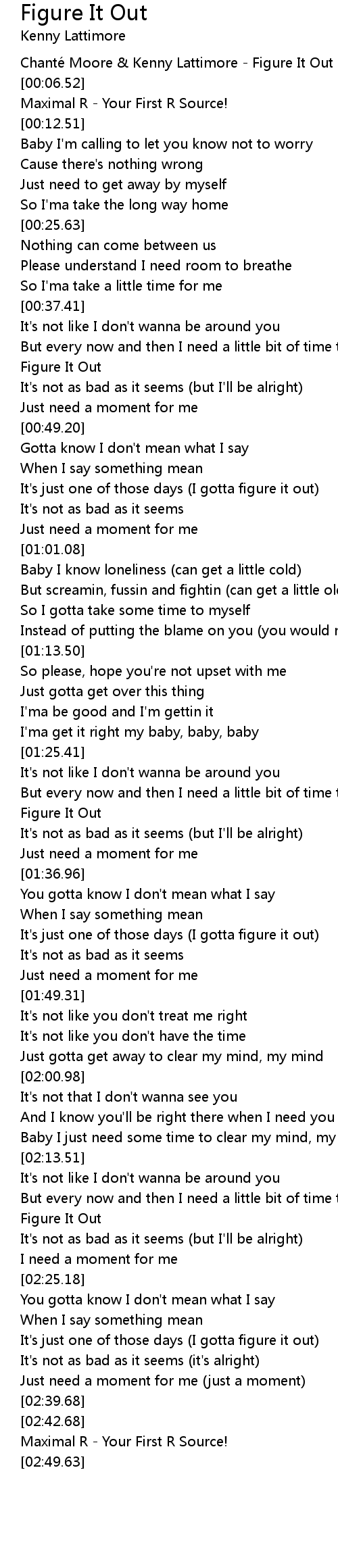 | [00:03.62] | Chanté Moore & Kenny Lattimore - Figure It Out |