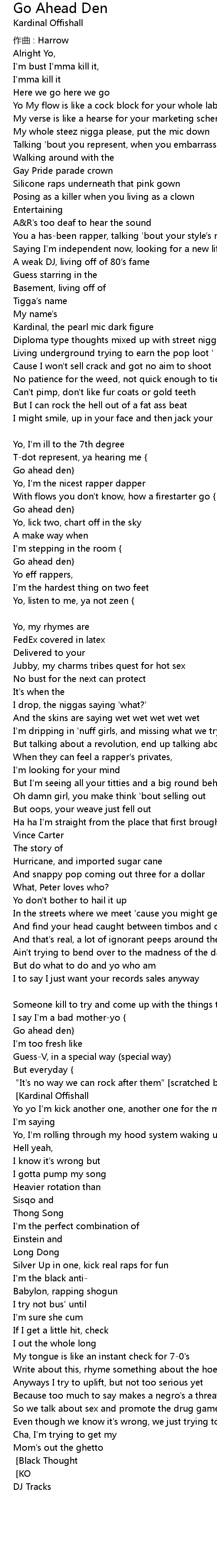 | Go ahead den} [Black Thought] "It's no way we can rock after them" [scratched by DJ Tracks] [Kardinal Offishall] | |