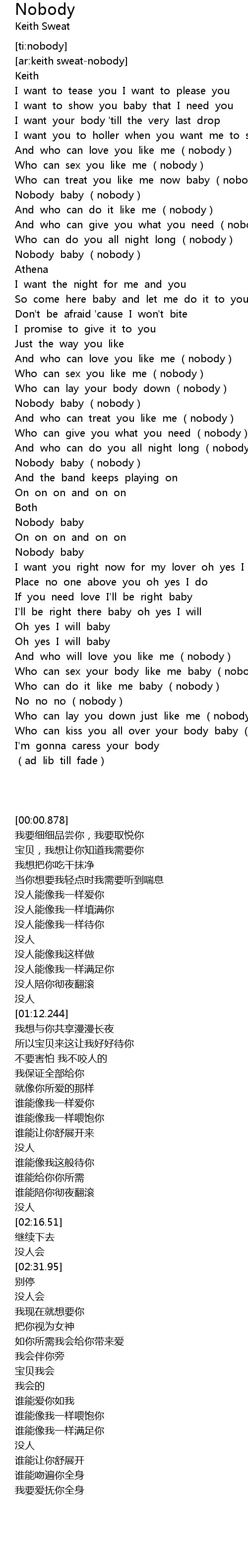 | [00:46.701] | Who can treat you like me now baby nobody |