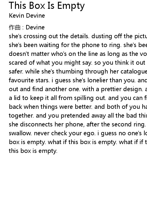 | she' s crossing out the details. dusting off the picture frames, it' s saturday. she' s been waiting for the phone to ring. she' s been waiting all night. but it doesn' t matter who' s on the line as long as the voice works. but you' re too scared of what you might say. so you think it out on paper, hypothetical and safer. while she' s thumbing through her catalogues, picking birthday cards, her favourite stars. i guess she' s lonelier than you. and if this box is empty. go out and find another one. with a prettier design. and greater depth inside. and a lid to keep it all from spilling out. and you can fill it up with letters. back when things were better. and both of you had blinders on and story books together. and you pretended away all the bad things all the bad things. and now she disconnects her phone, after the second ring. and all the drama you can swallow. never check your ego. i guess no one' s lonelier than you. and if this box is empty. what if this box is empty. what if if this box is empty. what if this box is empty. |