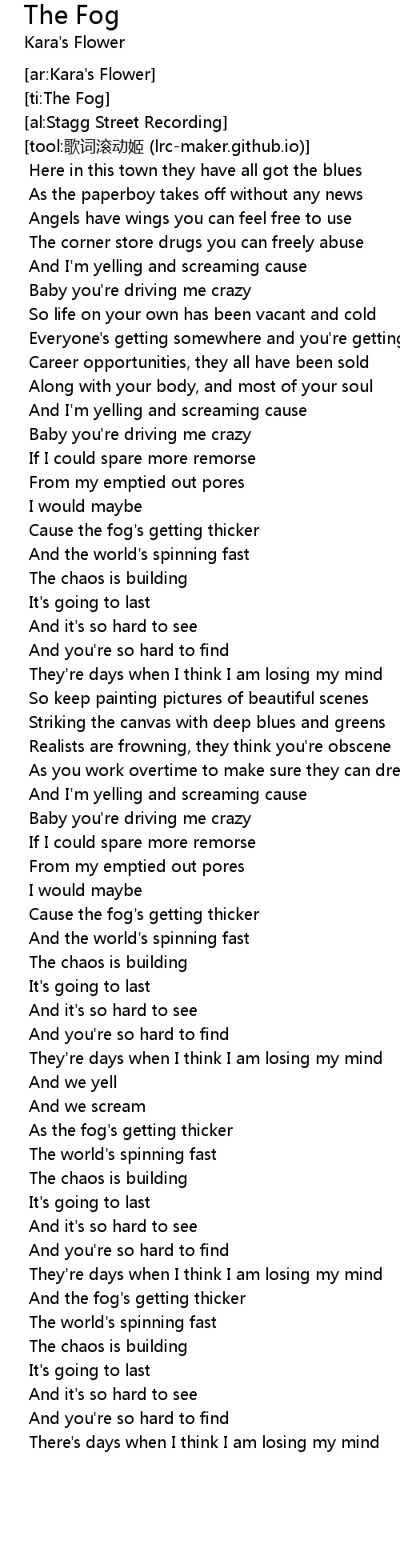 | [01:57.477] | Cause the fog's getting thicker |