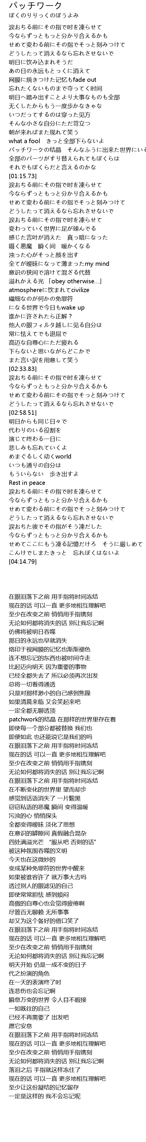 | [01:04.58] | patchwork的结晶 在那样的世界里存在着 |