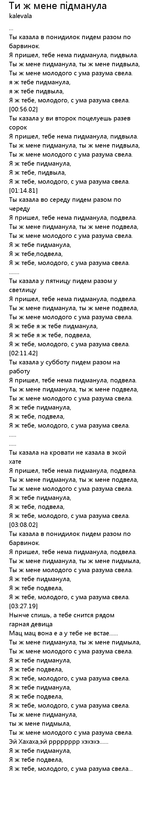 [03:14.54] Ты ж мене пидманула, ты ж мене пидмыла,