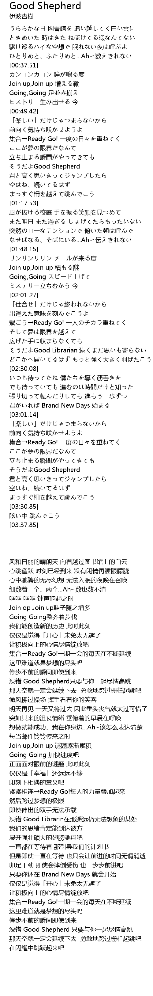 | [01:05.45] | そうだよGood Shepherd 君と高く思いきってジャンプしたら |
