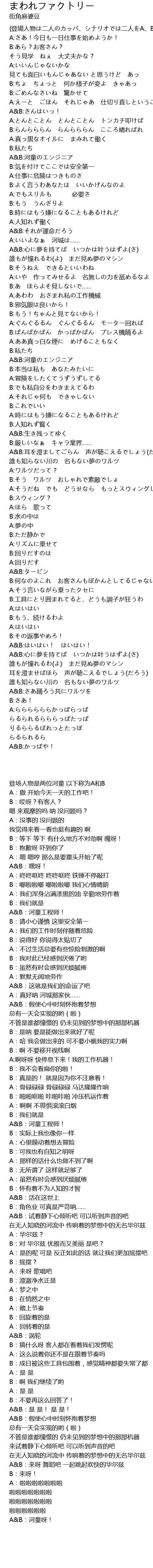 | [00:01.000] | (登場人物は二人のカッパ、シナリオでは二人をA、Bという) |