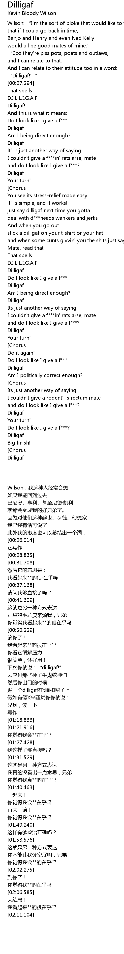| [01:53.576][Chorus] | Dilligaf! |