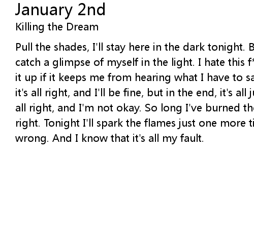 Pull the shades, I'll stay here in the dark tonight. Because I'm afriad I might catch a glimpse of myself in the light. I hate this f**king song, but I'll turn it up if it keeps me from hearing what I have to say. So I'll tell myself that it's all right, and I'll be fine, but in the end, it's all just lies. Nothing's all right, and I'm not okay. So long I've burned the truth trying to make it right. Tonight I'll spark the flames just one more time. Everything's gone wrong. And I know that it's all my fault.