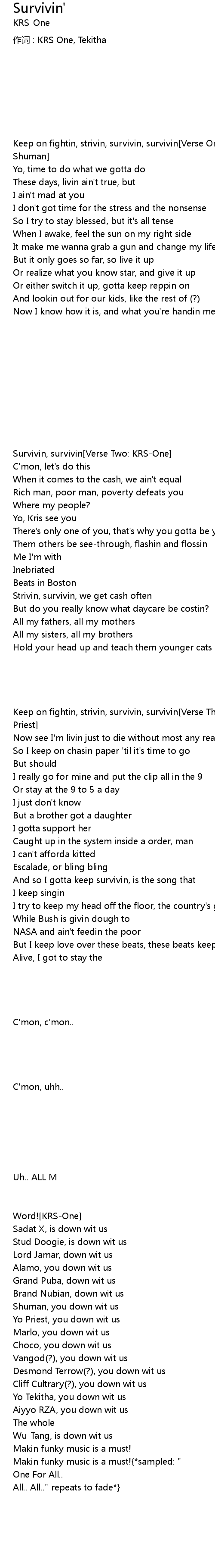 | Keep on fightin, strivin, survivin, survivin[Verse One: uncredited - possibly Shuman] | |