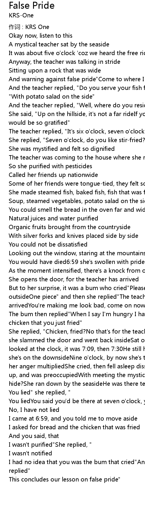 | She replied, " Chicken, fried? No that' s for the teacher, you' re not purifiedThen she slammed the door and went back insideSat on the couch with the TV GuideShe looked at the clock, it was 7: 09, then 7: 30He still hasn' t arrivedEight o' clock, she' s on the downsideNine o' clock, by now she' s tearyeyedShe' s pissed off and her anger multipliedShe cried, then fell asleep dissatisfiedNext day she woke up, and was preoccupiedWith meeting the mystical teacher who liedWhere could he hide? She ran down by the seasideHe was there teaching about false pride" | |