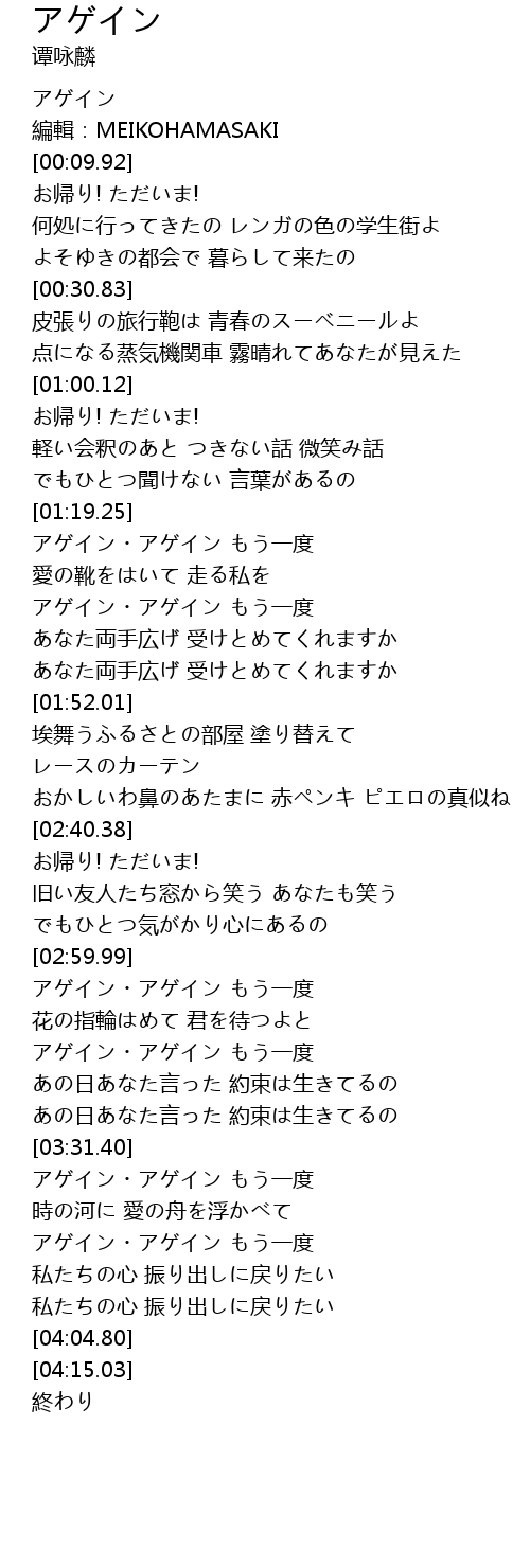 | [03:32.15] | アゲイン・アゲイン もう一度 |