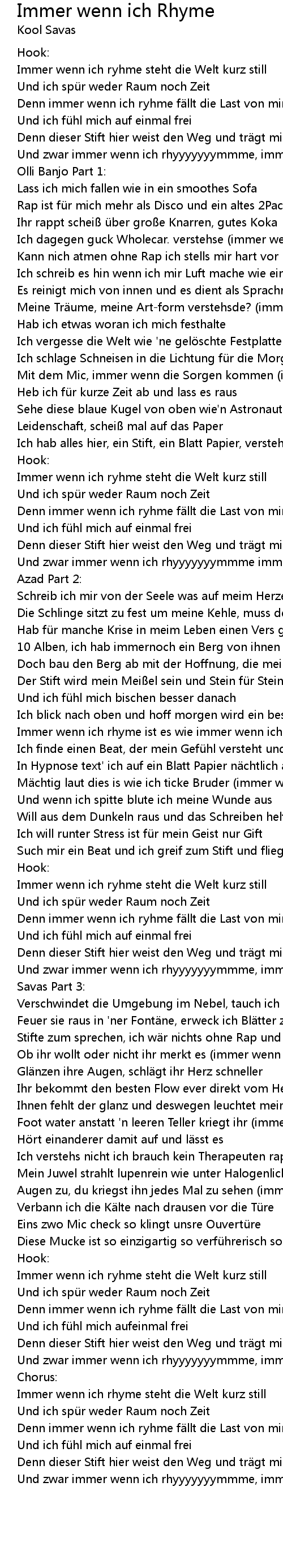 | Und zwar immer wenn ich rhyyyyyyymmme immer wenn ich rhyme | |