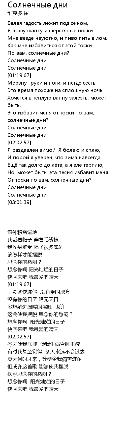 | [01:43.14] | Это избавит меня от тоски по вам, солнечные дни? |