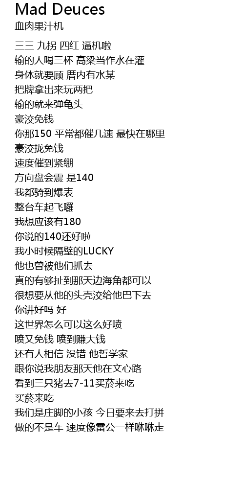| [02:06.05] | 做的不是车 速度像雷公一样咻咻走 |