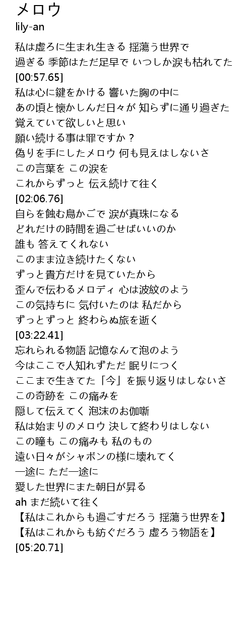 | [05:06.67] | 【私はこれからも紡ぐだろう 虚ろう物語を】 |