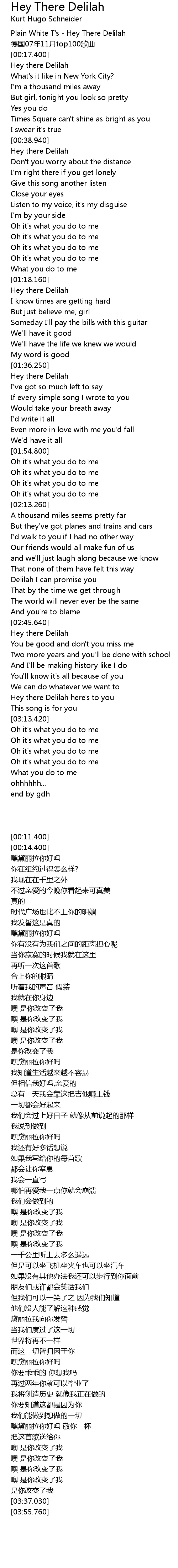| [00:11.400] | Plain White T' s Hey There Delilah |