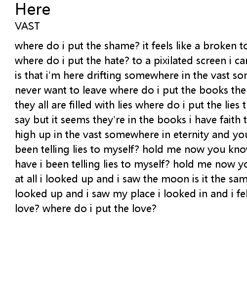 where do i put the shame? it feels like a broken toy i can't play with anymore where do i put the hate? to a pixilated screen i can't watch anymore all i know is that i'm here drifting somewhere in the vast somewhere in eternity and i never want to leave where do i put the books there's so many i could read but they all are filled with lies where do i put the lies there's so many i could say but it seems they're in the books i have faith that you're out there living high up in the vast somewhere in eternity and you're never going to leave have i been telling lies to myself? hold me now you know i'm so afraid to be at all have i been telling lies to myself? hold me now you know i'm so afraid to love at all i looked up and i saw the moon is it the same one that betrayed you? i looked up and i saw my place i looked in and i felt no hate where do i put the love? where do i put the love?