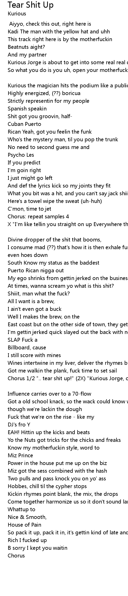 Chorus 1/2 ".. tear shit up!" (2X) "Kurious Jorge, on the welfare line.." [Kurious] |