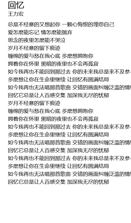 | [01:33.340] | 回忆它总是让人百感交集 加深我无尽的忧郁 |