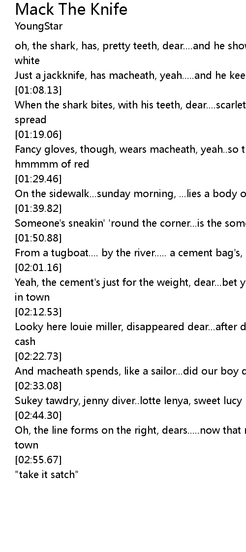 Just a jackknife, has macheath, yeah.....and he keeps it, out of sight |