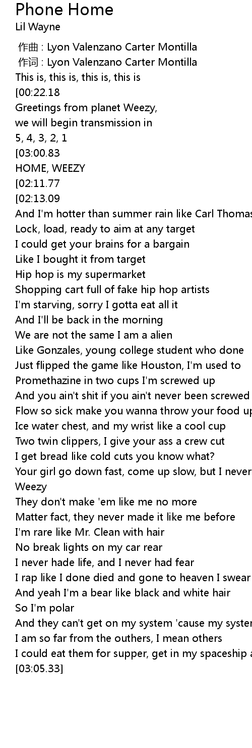 | [03:02.29][03:00.83][02:55.56][02:53.93][02:52.36][02:50.53][02:16.73][02:15.20][02:10.19][02:08.54][02:06.93][02:05.61][01:31.19][01:29.63][01:24.76][01:23.14][01:21.41][01:19.75][00:52.30][00:50.59][00:45.82][00:44.20][00:42.76][00:40.92] | PHONE HOME, WEEZY |