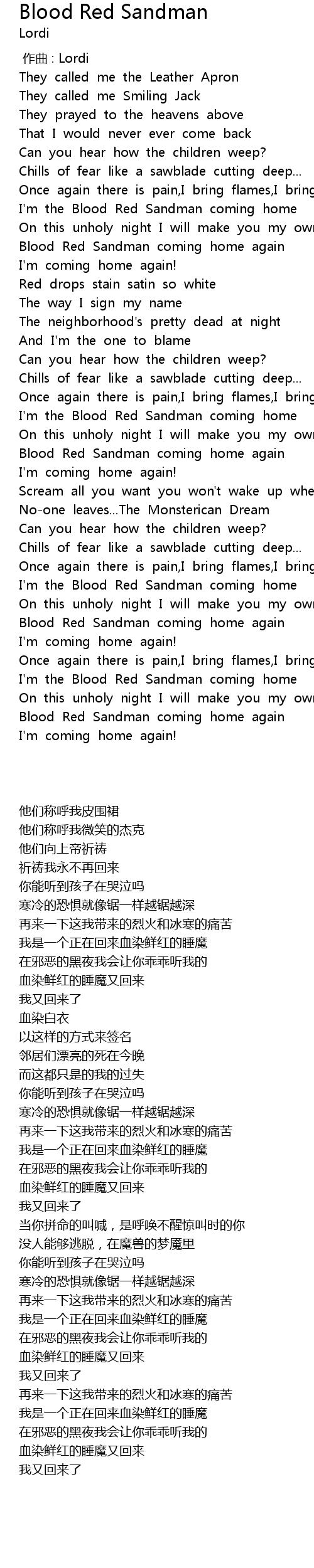 | [02:58.88] | I' m the Blood Red Sandman coming home |