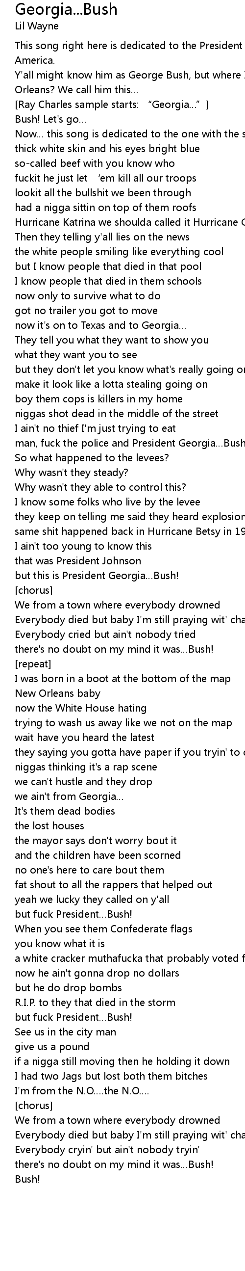 | Y' all might know him as George Bush, but where I' m from? The lost city of New Orleans? We call him this | |
