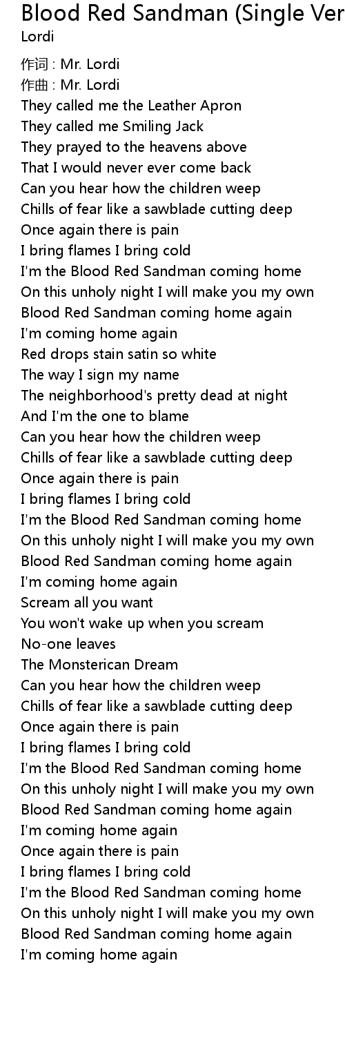 | [02:59.049] | I' m the Blood Red Sandman coming home |