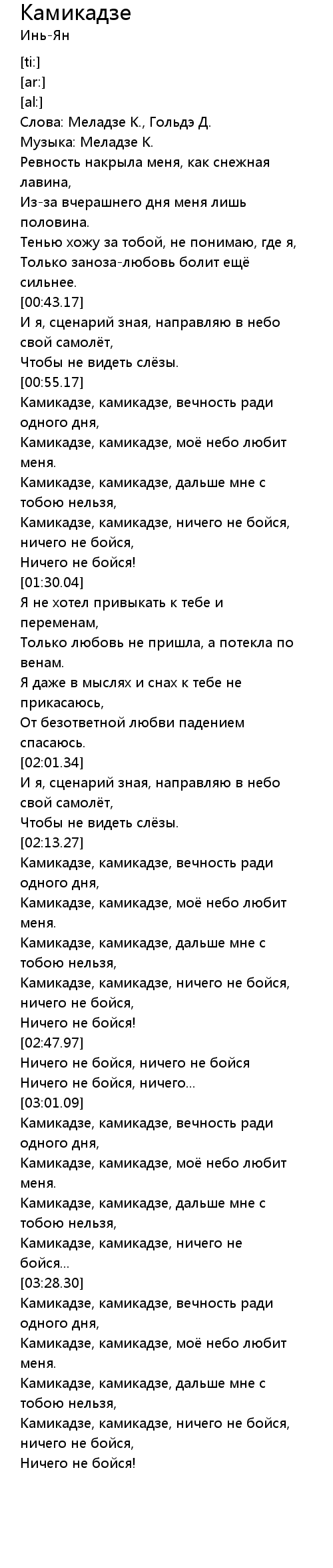 [02:35.48] Камикадзе, камикадзе, ничего не бойся, ничего не бойся,