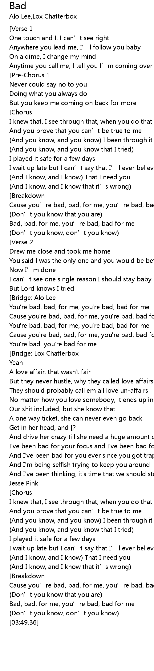 | [01:48.70] | You' re bad, bad, for me, you' re bad, bad for me |