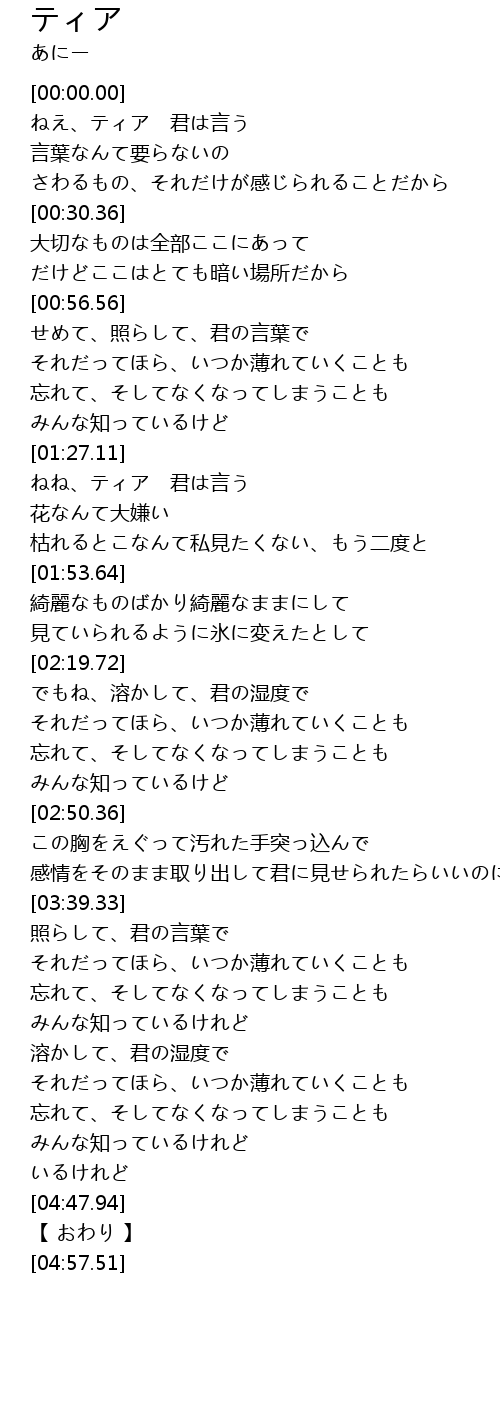 | [00:05.71] | ねえ、ティア 君は言う |