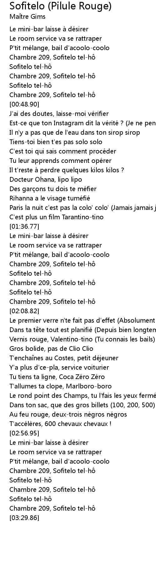 | [00:45.70] | Chambre 209, Sofitelo telh |