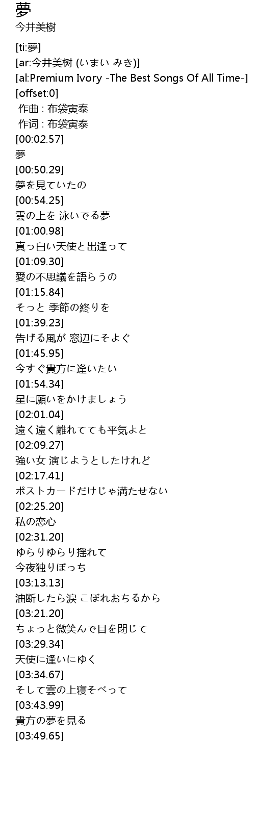 | [00:55.78] | 雲の上を 泳いでる夢 |