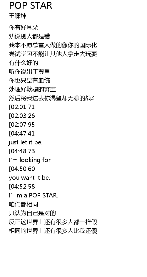 | [04:59.99][04:52.58][04:45.07][04:37.53][04:30.13][04:22.70][04:15.53][04:11.76][04:08.08][04:04.22][03:59.95][03:52.72][03:45.07][03:37.50][02:45.25][02:37.68][02:30.01][02:22.81] | And I’m a POP STAR. |