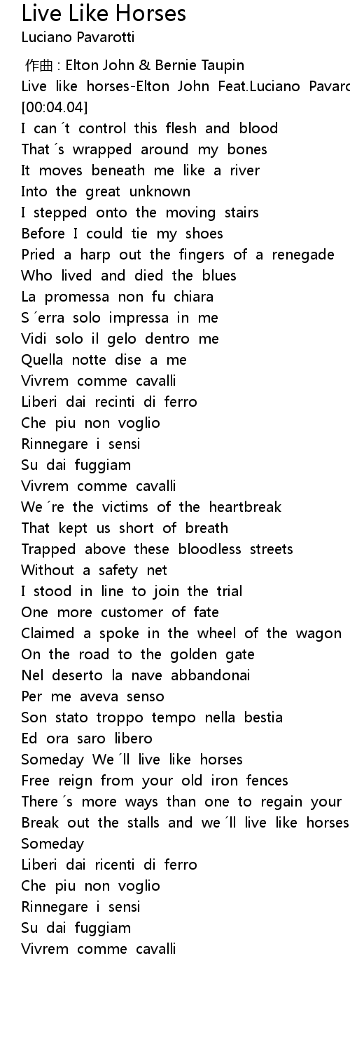 | [00:00.64] | Live like horses-Elton John Feat.Luciano Pavarotti |