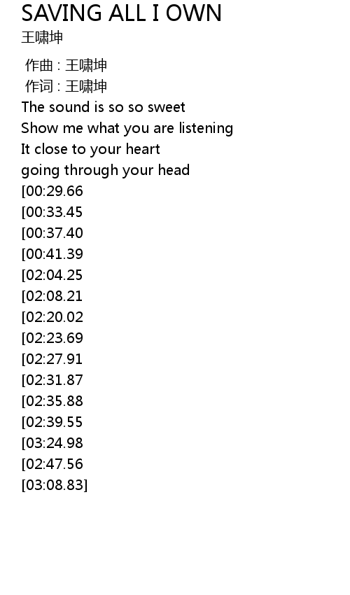 | [02:12.18][02:04.25][00:53.27][00:45.82] | Saving all my own |