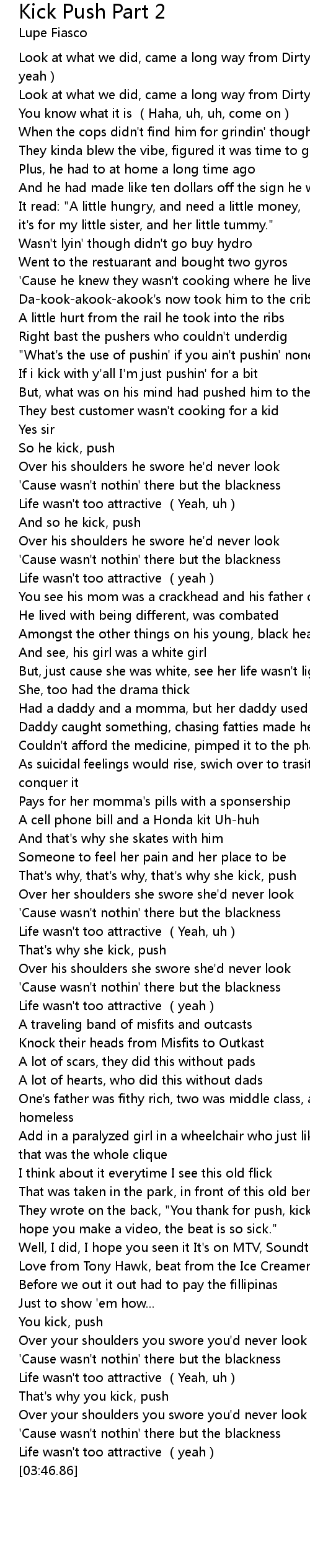 | [03:06.53] | They wrote on the back, "You thank for push, kick, |