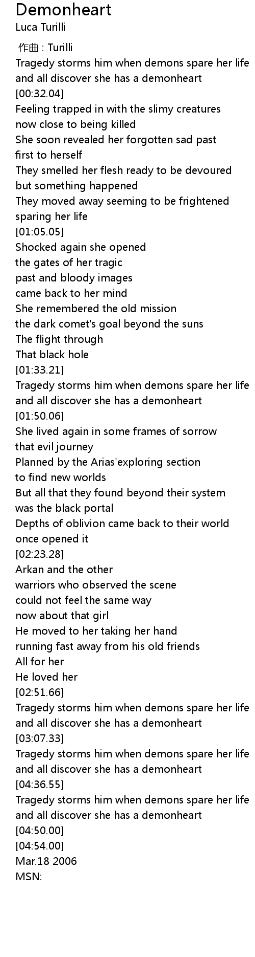 | [01:38.11] | Tragedy storms him when demons spare her life |