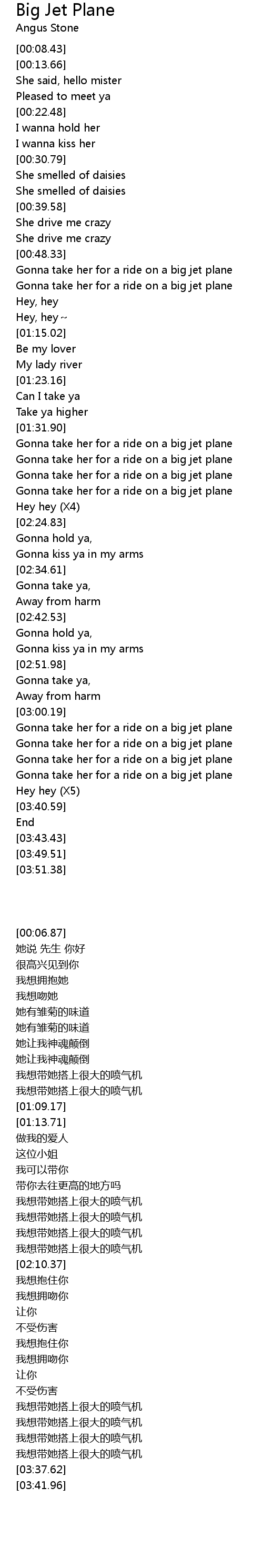 | [02:02.94] | Gonna take her for a ride on a big jet plane |