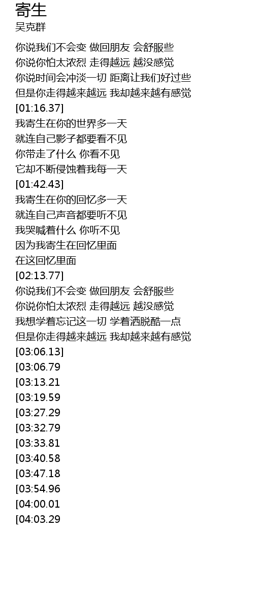 | [04:45.81][03:33.81] | 我寄生在你的回忆多一天 |