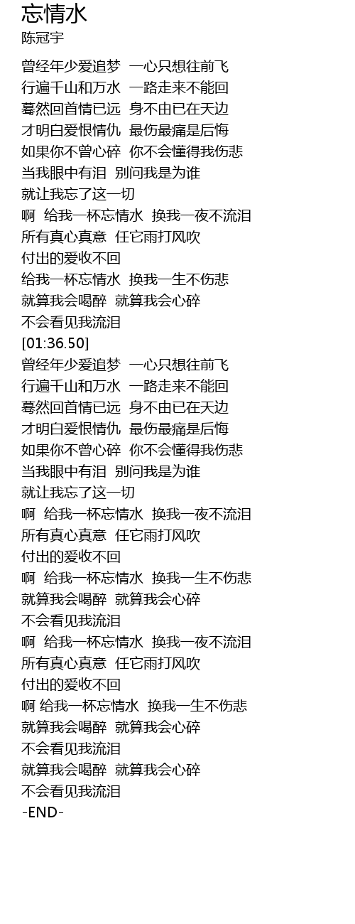 | [03:33.71] | 啊 给我一杯忘情水 换我一生不伤悲 |