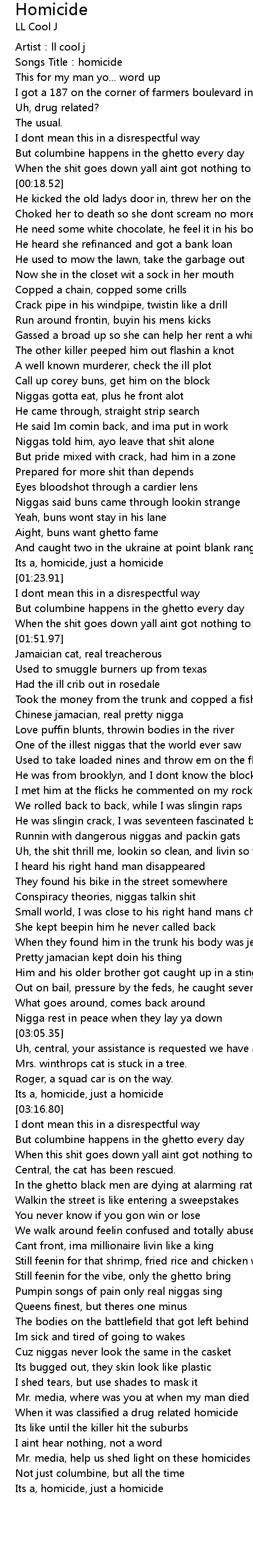 | [00:01.38] | Songs Title:homicide |