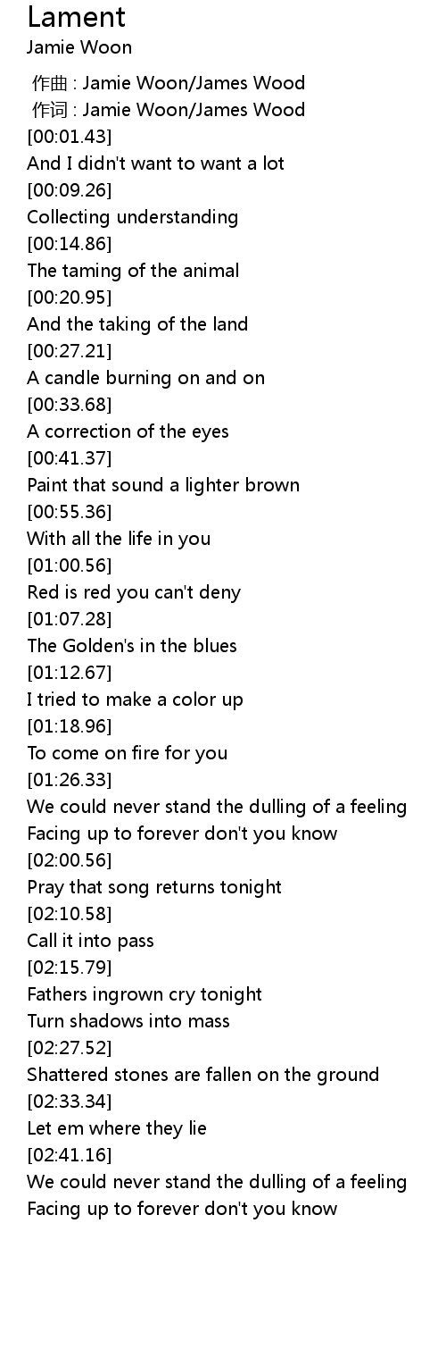 | [00:00.00] | zuo qu : Jamie Woon James Wood |