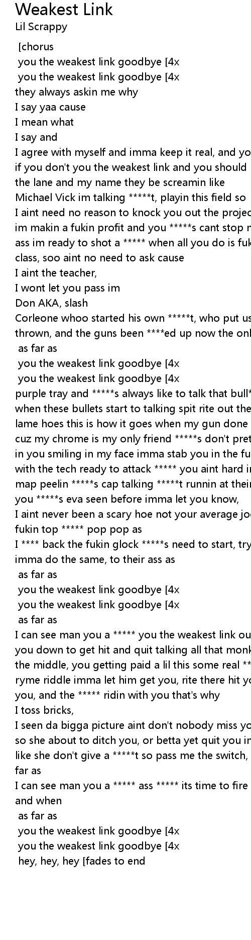 | [2x] you the weakest link goodbye [4x] [Trillville] hey, hey, hey [fades to end] |