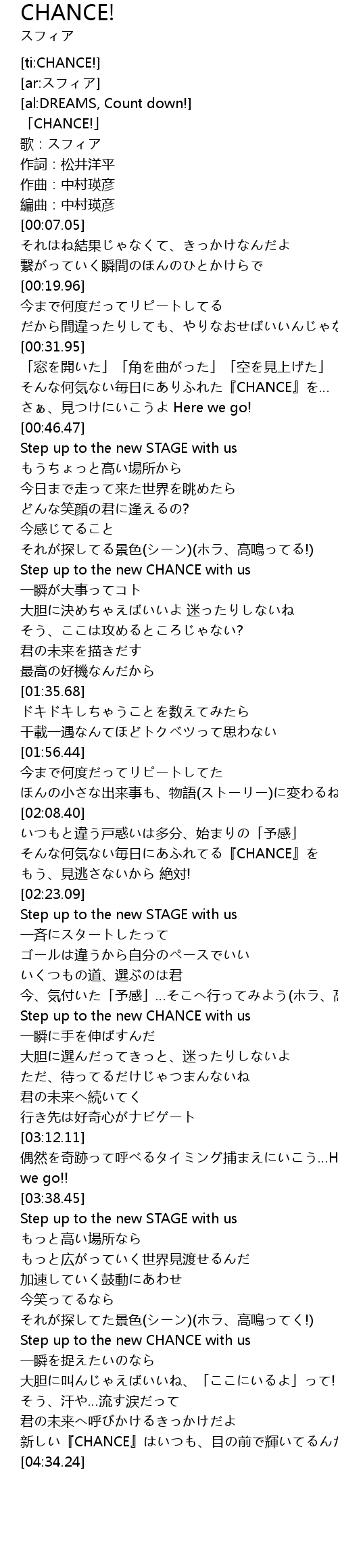 | [04:25.63] | 新しい『CHANCE』はいつも、目の前で輝いてるんだ |