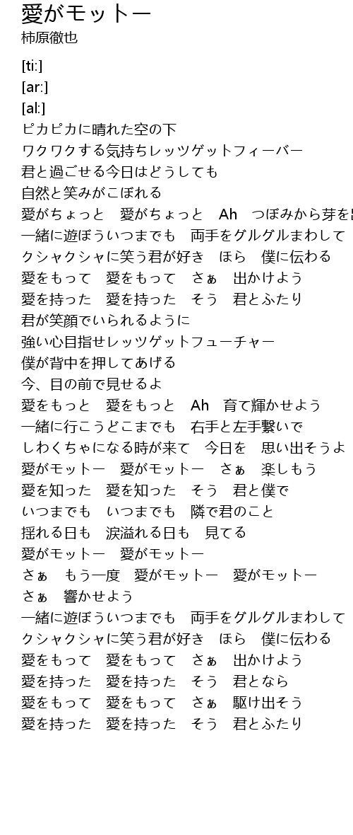 | [02:09.01] | 愛がモットー 愛がモットー さぁ 楽しもう |