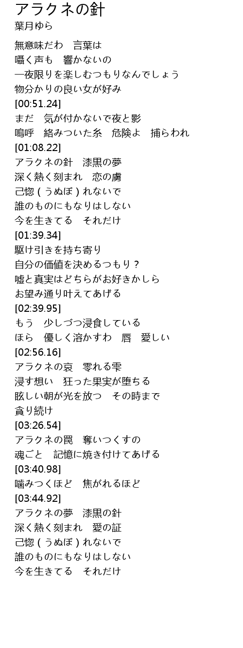 | [03:46.76] | アラクネの夢 漆黒の針 |